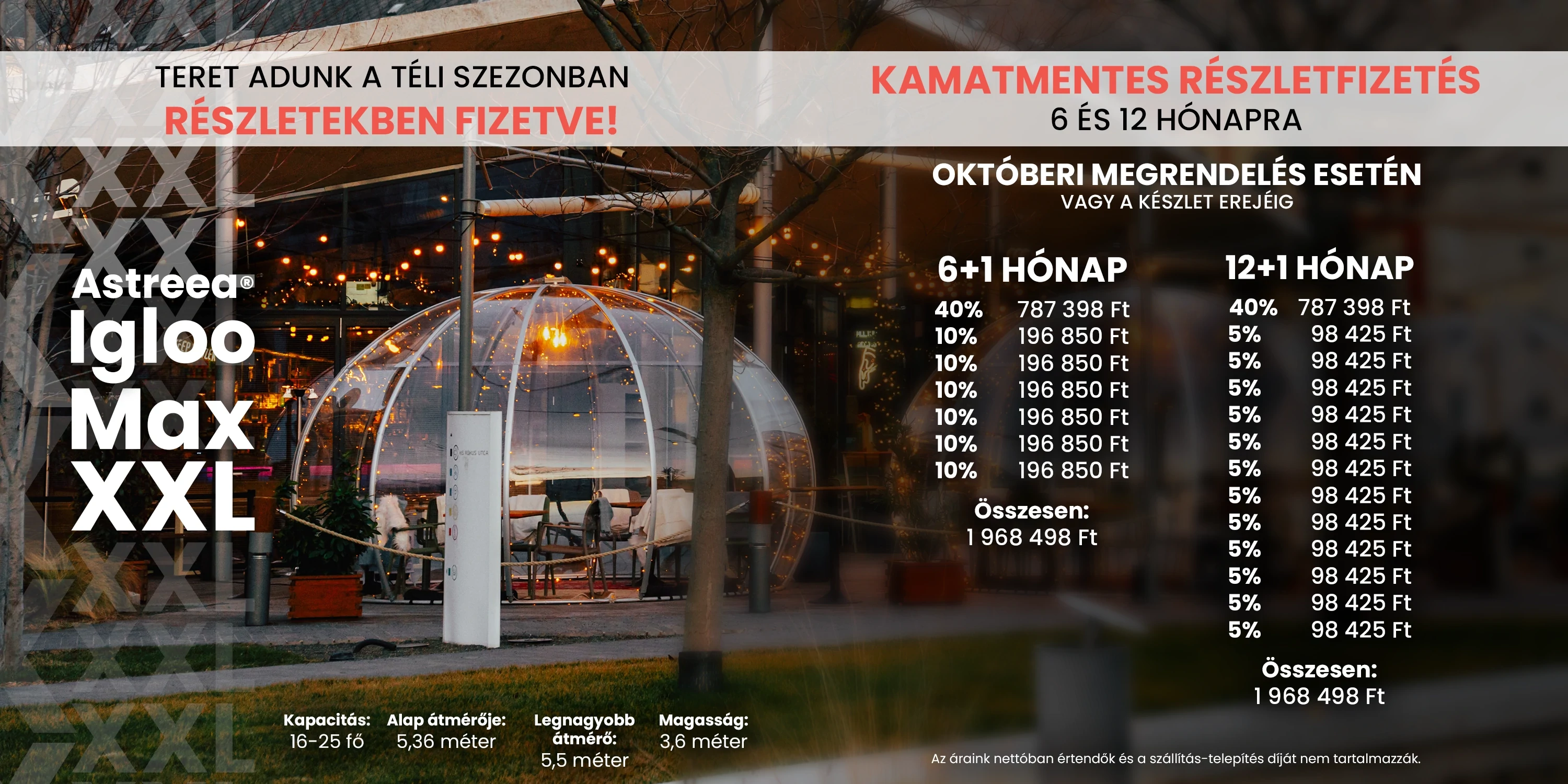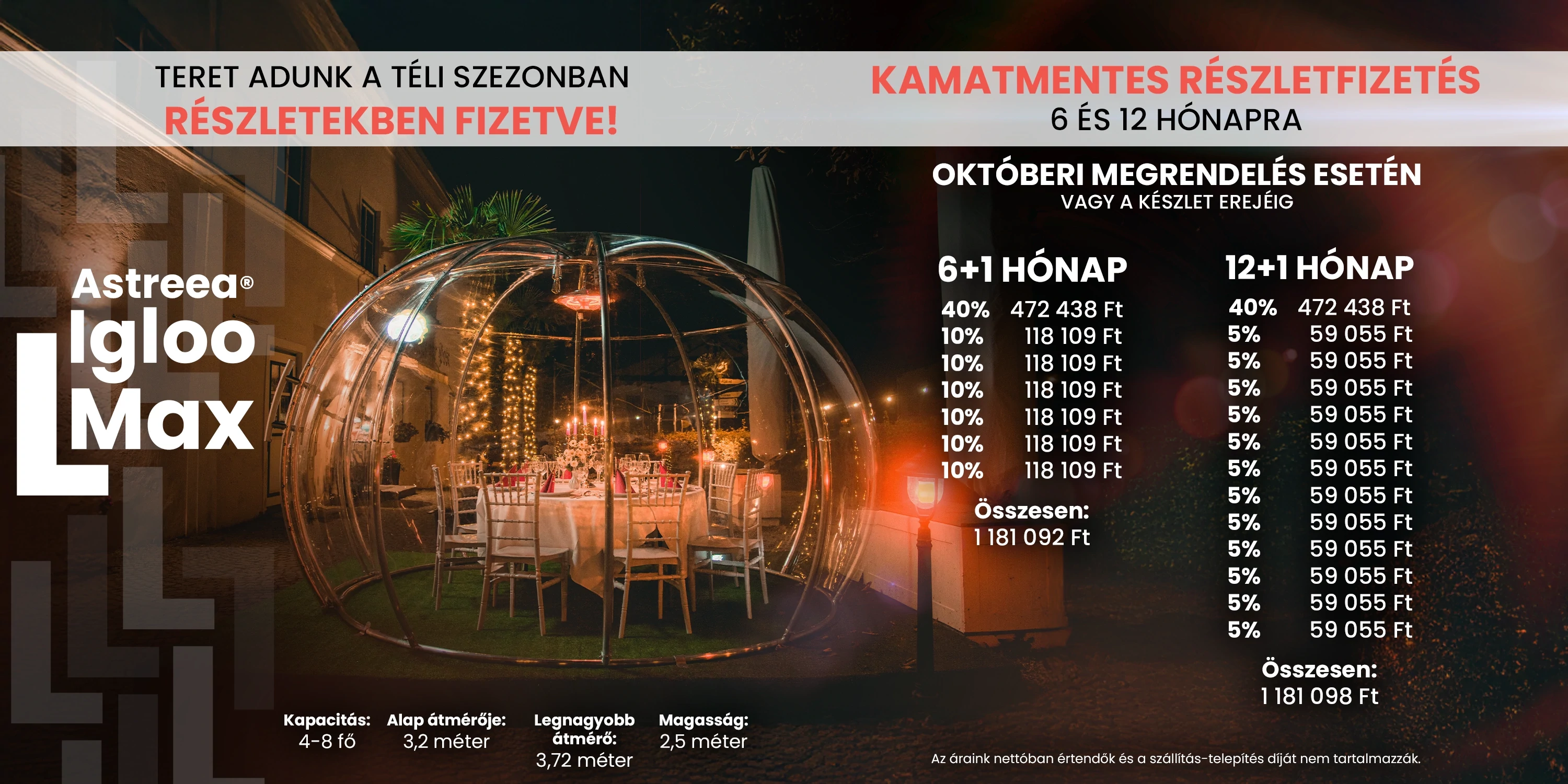 Az Astreea Igloo teret ad, mi pedig egész októberben (vagy a készlet erejéig) lehetőséget biztosítunk különböző kamatmentes részletfizetési konstrukciókra, hogy vállalkozásodat közösen vezessük sikerre!